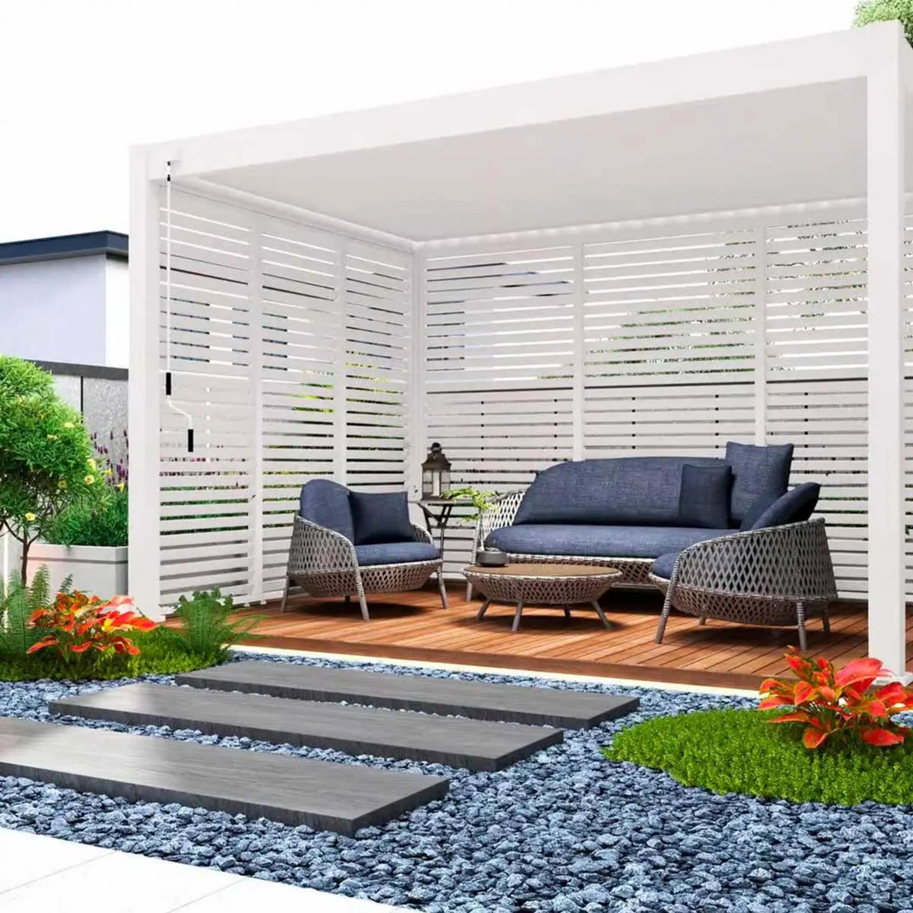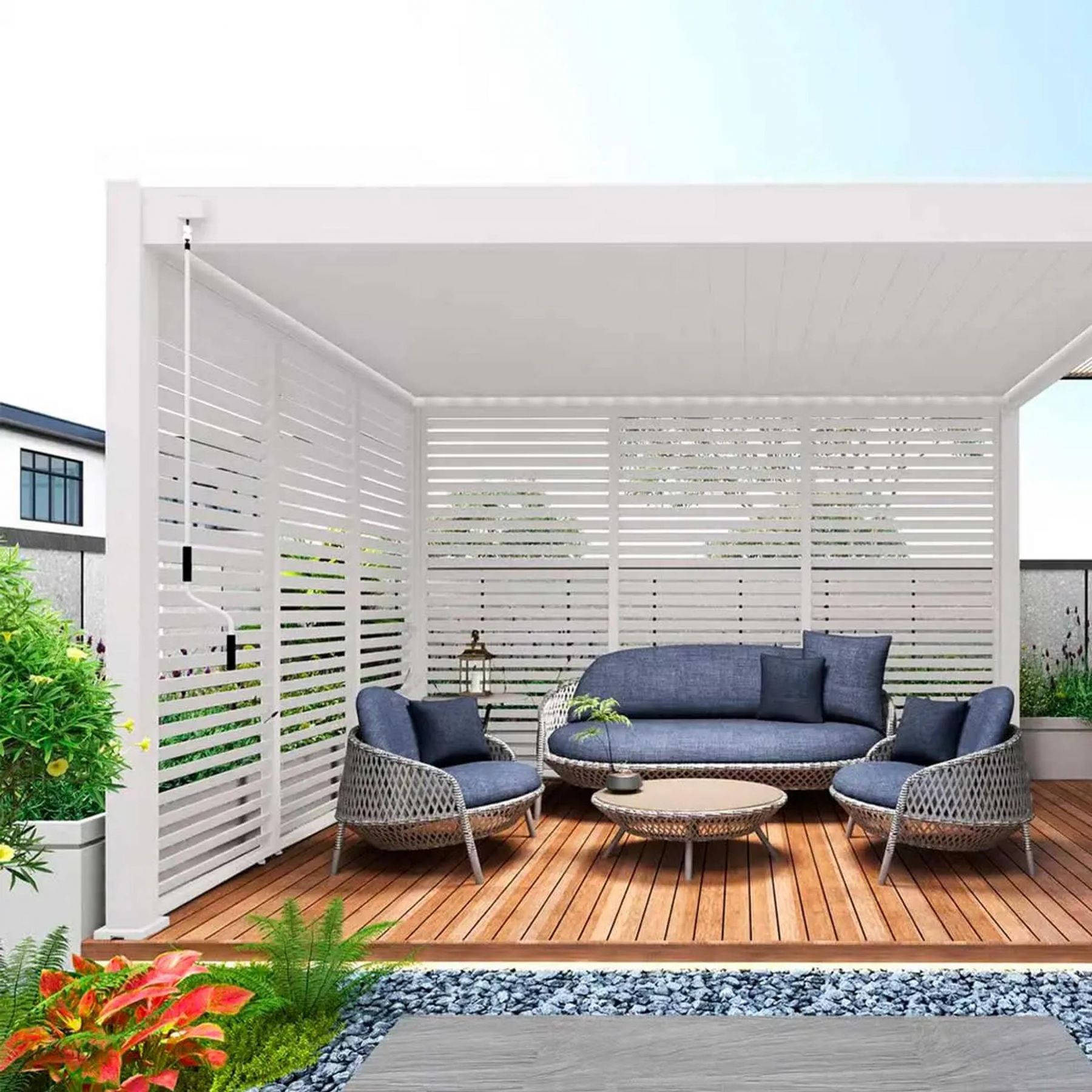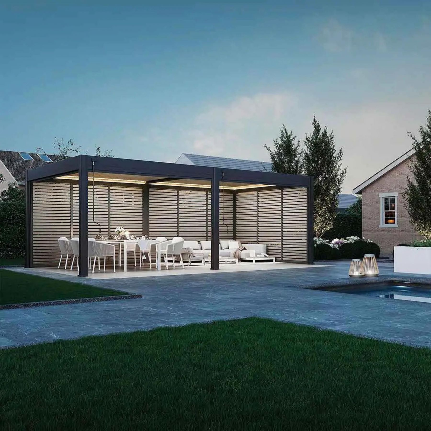Современная биоклиматическая пергола Aquaviva Модерн является инновационным решением для создания стильной зоны отдыха. Она идеально подходит для тех, кто ценит не только эстетику, но и высокий уровень комфорта, а также уникальность каждой детали. Пергола Модерн Aquaviva станет отличным выбором благодаря своим универсальным характеристикам и многофункциональности, позволяя создать атмосферу уюта и расслабления на открытом воздухе. Алюминиевые перголы Aquaviva Модерн отличаются прочностью, долговечностью и устойчивостью к коррозии, что делает их идеальными для использования в любых климатических условиях. Они могут быть выполнены в различных стилях и размерах, что позволяет каждому владельцу подобрать вариант, который соответствует его изысканному вкусу, а также потребностям самого пространства. Эти перголы отлично подойдут не только для загородного дома или виллы, но и для кафе, ресторанов и зон отдыха у бассейна или на пляже.