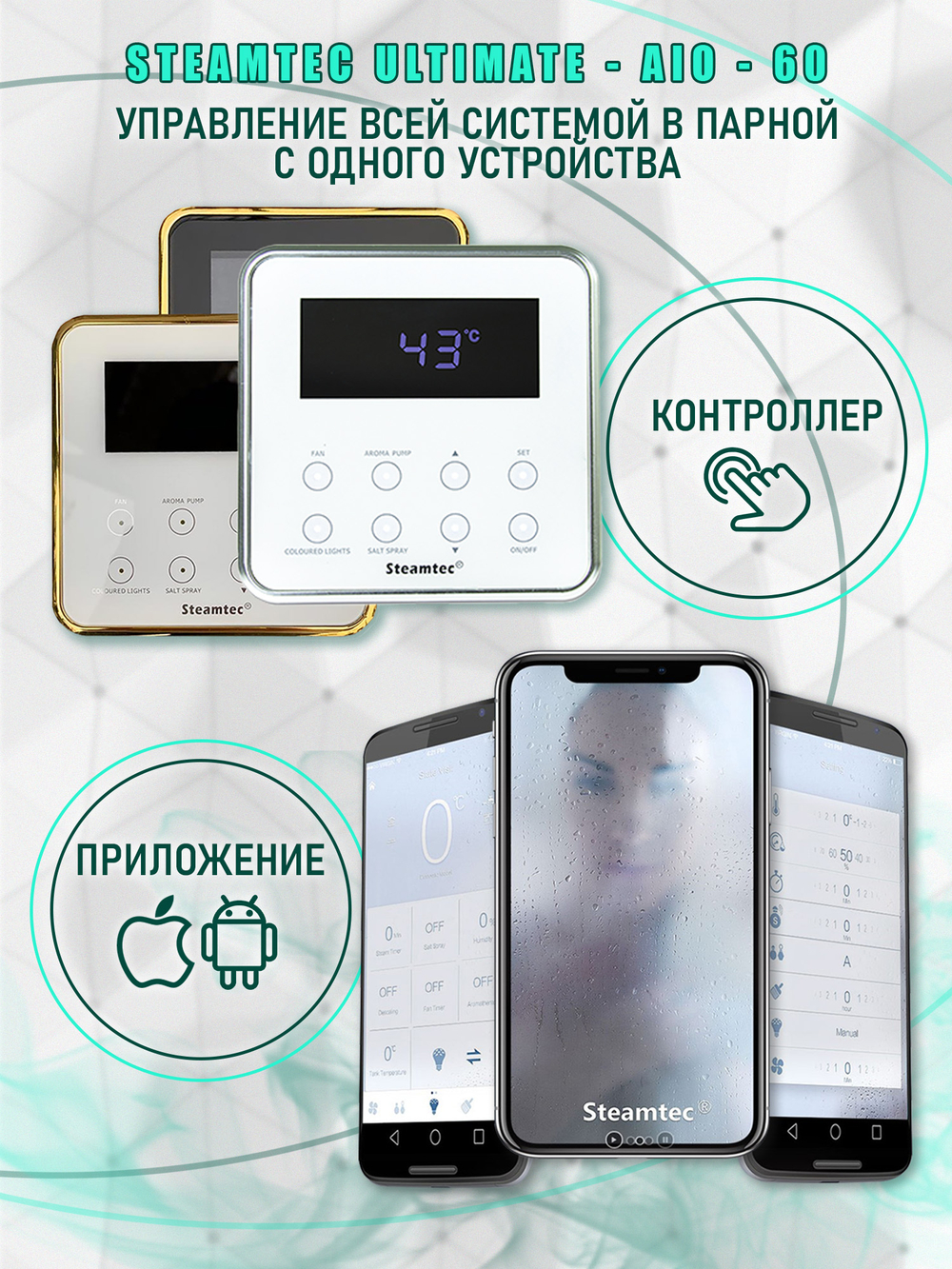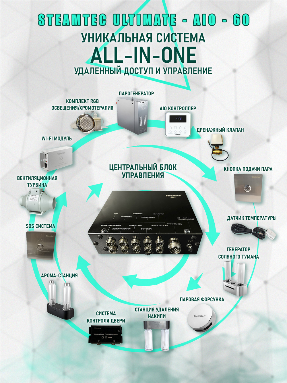 Steamtec TOLO AIO 60 - 6 кВт парогенератор для хамама и турецкой бани / Серия Premium. Парогенератор для хамама и турецкой бани Steamtec TOLO 60 AIO - 6 кВт. Компактный проточный парогенератор «STEAMTEC» TOLO-60 AIO - 6 кВт станет отличным решением для вашей бани или хамама. Эта модель пользуется особой популярностью среди покупателей, благодаря сочетанию низкой цены и богатого функционала. Генератор пара обладает простым управлением через влагостойкую панель с сенсорным экраном, данную панель можно размещать внутри хамама. Модель очень надежная и практичная в использовании и уходе: промывка происходит автоматически при помощи дренажного клапана. Парогенератор не только максимально компактен, он еще и экономно потребляет электроэнергию. Комплектующие выполнены из надежных и качественных материалов, что гарантирует покупателям длительный срок эксплуатации. В модели имеется таймер, регулирующий время работы устройства. Дистанционное управление позволяет не только регулировать работу парогенератора, но и выключать свет в помещении.
