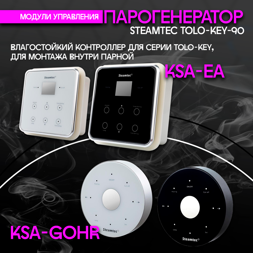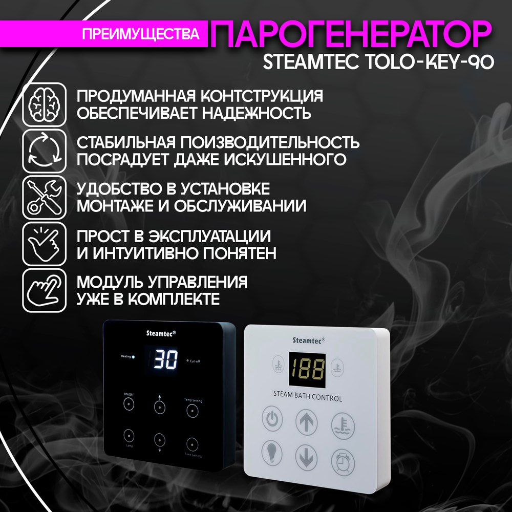 Steamtec TOLO KEY 90 - 9кВт (стандартный модуль управления)/ парогенератор для хамама и турецкой бани. Получите максимальное удовольствие от посещения хамама с парогенераторами для хамама Steamtec Tolo Key! Хамам - это место, где можно погрузиться в атмосферу релаксации и оздоровления. И чтобы создать идеальные условия для этого, необходимо обеспечить правильную влажность и комфортную температуру. Именно поэтому мы предлагаем вам парогенераторы для хамама Steamtec Tolo Key. Наши парогенераторы для хамама обладают мощностью от 3 кВт до 24 кВт, что позволяет выбрать идеальную модель для вашего хамама. Благодаря этому, вы сможете наслаждаться оптимальными условиями парения, которые будут соответствовать вашим предпочтениям и потребностям. Одним из преимуществ парогенераторов для хамама Steamtec Tolo Key является возможность выбора цвета контроллера (пульта). Вы можете заказать контроллер (пульт) в белом или черном цвете, чтобы он идеально сочетался с интерьером вашего хамама. Кроме того, для тех, кто хочет установить контроллер внутри хамама, доступна опция заказа влагостойкого контроллера в белом или черном цвете.