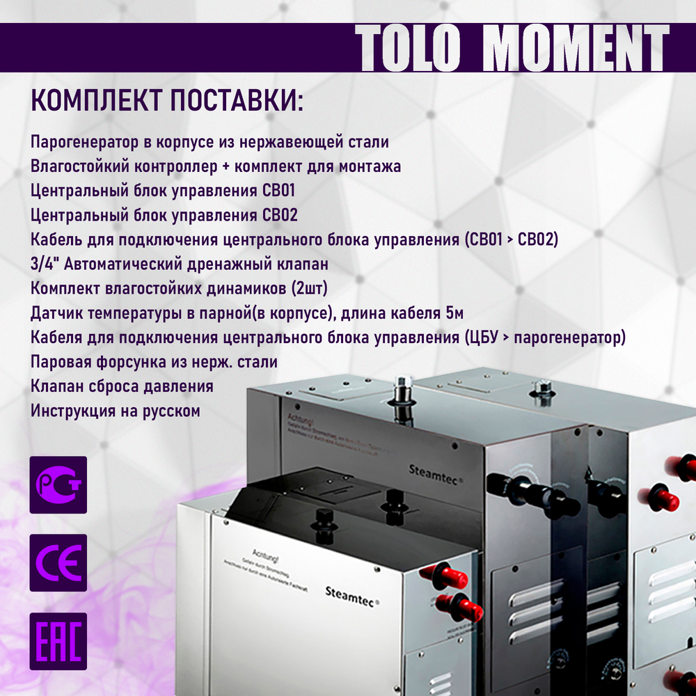 Компактный проточный парогенератор для хамама и турецкой бани «STEAMTEC» TOLO-120 MOMENT- 12 кВт станет отличным решением для вашей бани или хамама. Эта модель пользуется особой популярностью среди покупателей, благодаря сочетанию низкой цены и богатого функционала.