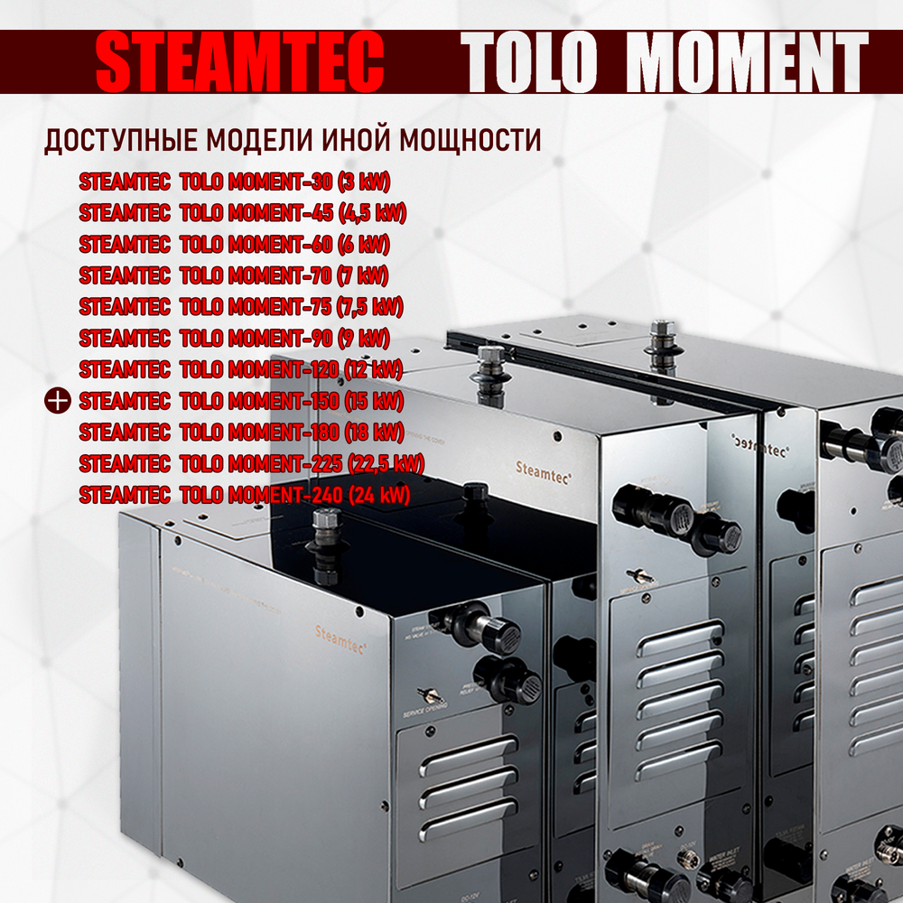 Компактный проточный парогенератор для хамама и турецкой бани «STEAMTEC» TOLO-150 MOMENT- 15 кВт  станет отличным решением для вашей бани или хамама. Эта модель пользуется особой популярностью среди покупателей, благодаря сочетанию низкой цены и богатого функционала.