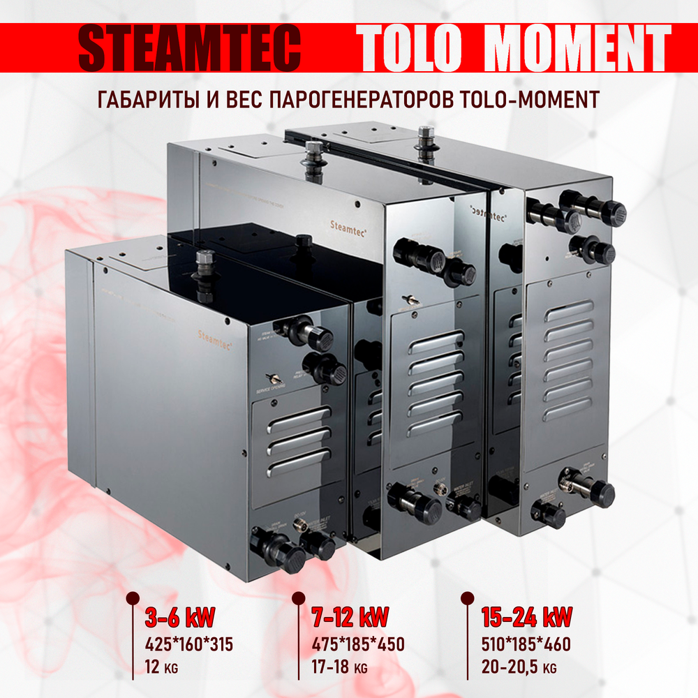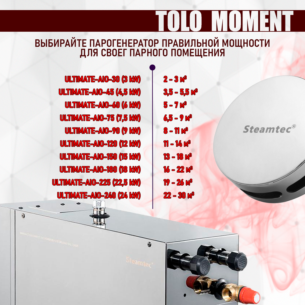 Steamtec TOLO MOMENT 150 - 15 кВт парогенераторы для хамама и турецкой бани / Серия PLATINUM со встроенной музыкой, пультом на 9-ти языках и возможностью монтажа без термодатчиков. Парогенератор премиум класса для хамама и турецкой бани Steamtec TOLO - MOMENT. Самая дорогая и многофункциональная модель парогенератора, является обновленной, доработанной и улучшенной версией парогенератора Steamtec TOLO Ultimate AIO. Теперь парогенератор стал маркой международного уровня, появилась возможность выбирать на дисплее меню на 9-ти языках, в том числе на русском. Возможен монтаж в двух вариантах: с термодатчиком и без. Если вы монтируете контроллер управления внутри парной (хамама), то в нем уже встроен термодатчик, и вам не нужно монтировать дополнительный термодатчик, а если контроллер монтируется снаружи парной, монтировать термодатчик в хамаме обязательно. Контроллеры управления влагостойкие, в черном или белом цвете. Данный контроллер можно устанавливать ВНУТРИ ПАРНОЙ!