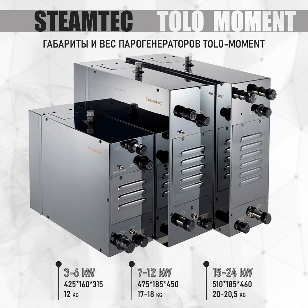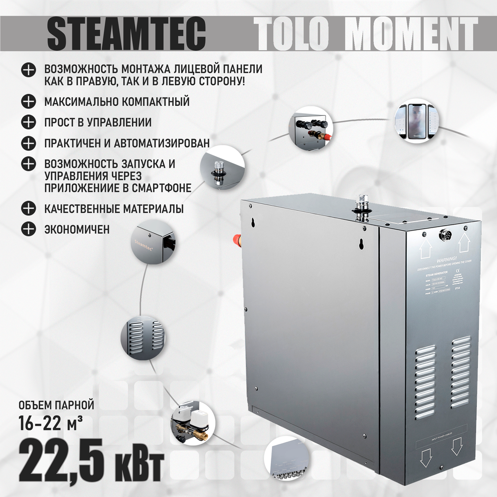 Компактный проточный парогенератор для хамама и турецкой бани Steamtec TOLO MOMENT 225 - 22,5 кВт станет отличным решением для вашей бани или хамама. Эта модель пользуется особой популярностью среди покупателей, благодаря сочетанию низкой цены и богатого функционала.