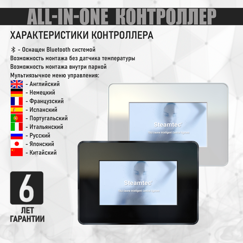 Генератор пара обладает простым управлением через влагостойкую панель с сенсорным экраном, данную панель можно размещать внутри хамама. Модель очень надежная и практичная в использовании и уходе: промывка происходит автоматически при помощи дренажного клапана, который поставляется в комплекте с парогенератором. Парогенератор не только максимально компактен, он еще и экономно потребляет электроэнергию.