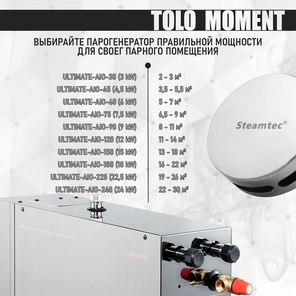 Компактный проточный парогенератор для хамама и турецкой бани Steamtec TOLO MOMENT 225 - 22,5 кВт станет отличным решением для вашей бани или хамама. Эта модель пользуется особой популярностью среди покупателей, благодаря сочетанию низкой цены и богатого функционала.