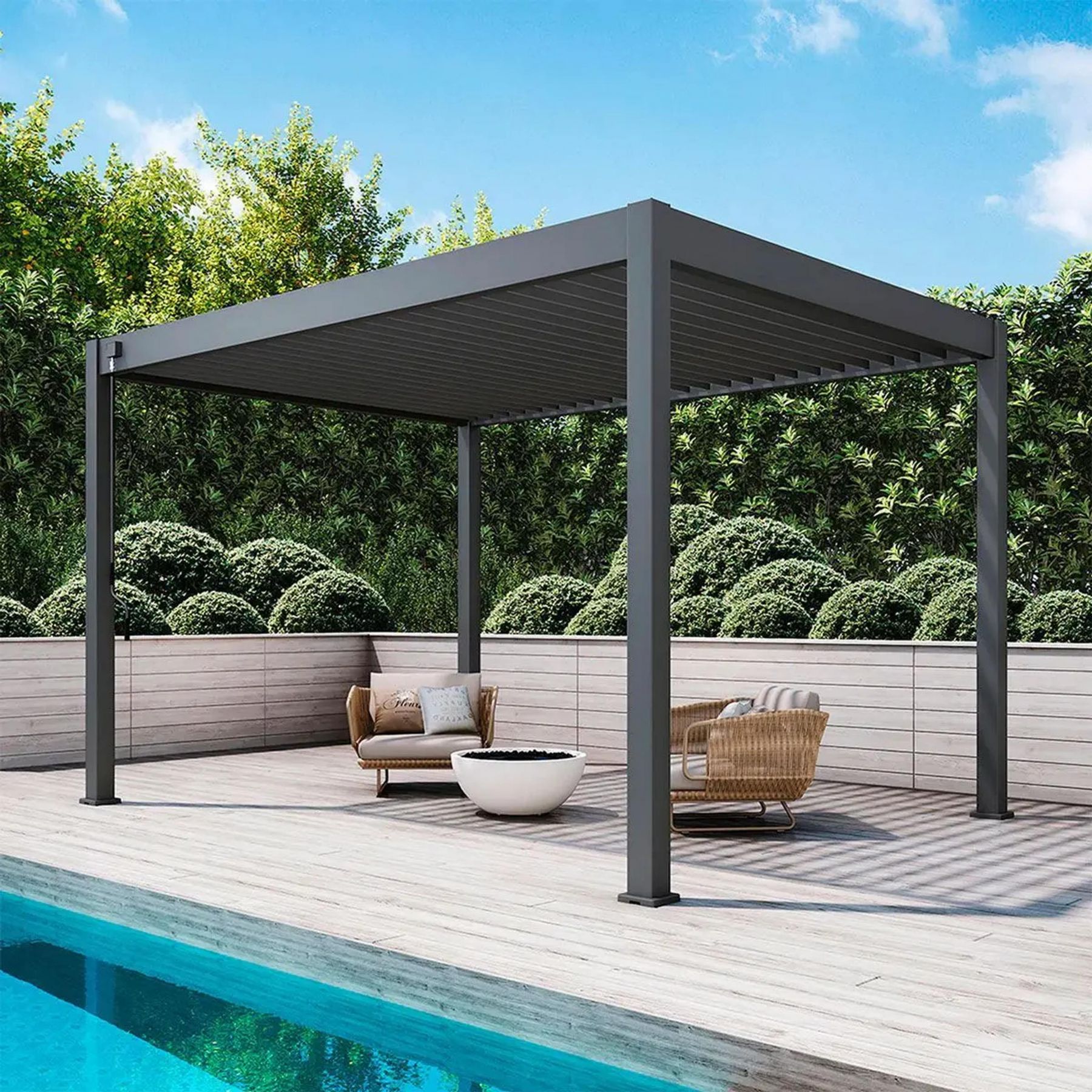 Материал: Перголы изготавливаются из высококачественного алюминиевого профиля 6063 T5/T6, отличающегося легкостью и прочностью. Они имеют порошковое покрытие, которое устойчиво к негативным атмосферным воздействиям.