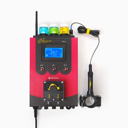 Универсальная станция химической дозации для контроля и поддержания рН (Водородный показатель) и окислительно-восстановительного потенциала (ОВП) Rx воды плавательных бассейнов объемом от 1 до 250м3. С двумя перистальтическим дозирующими насосами, производительностью 2,2л/ч. Возможно назначение второго дозирующего насоса на любой вид химии для плавательного бассейна (по умолчанию: 1 – рН (не переназначается), 2 – Cl (гипохлорит натрия). Производит управление насосом фильтровальной установки мощностью до 2,2 кВт, 220В и управление нагревом воды плавательного бассейна по сигналу с датчика температуры. Предусмотрена возможность удаленного управления и мониторинга с помощью мобильного приложения.